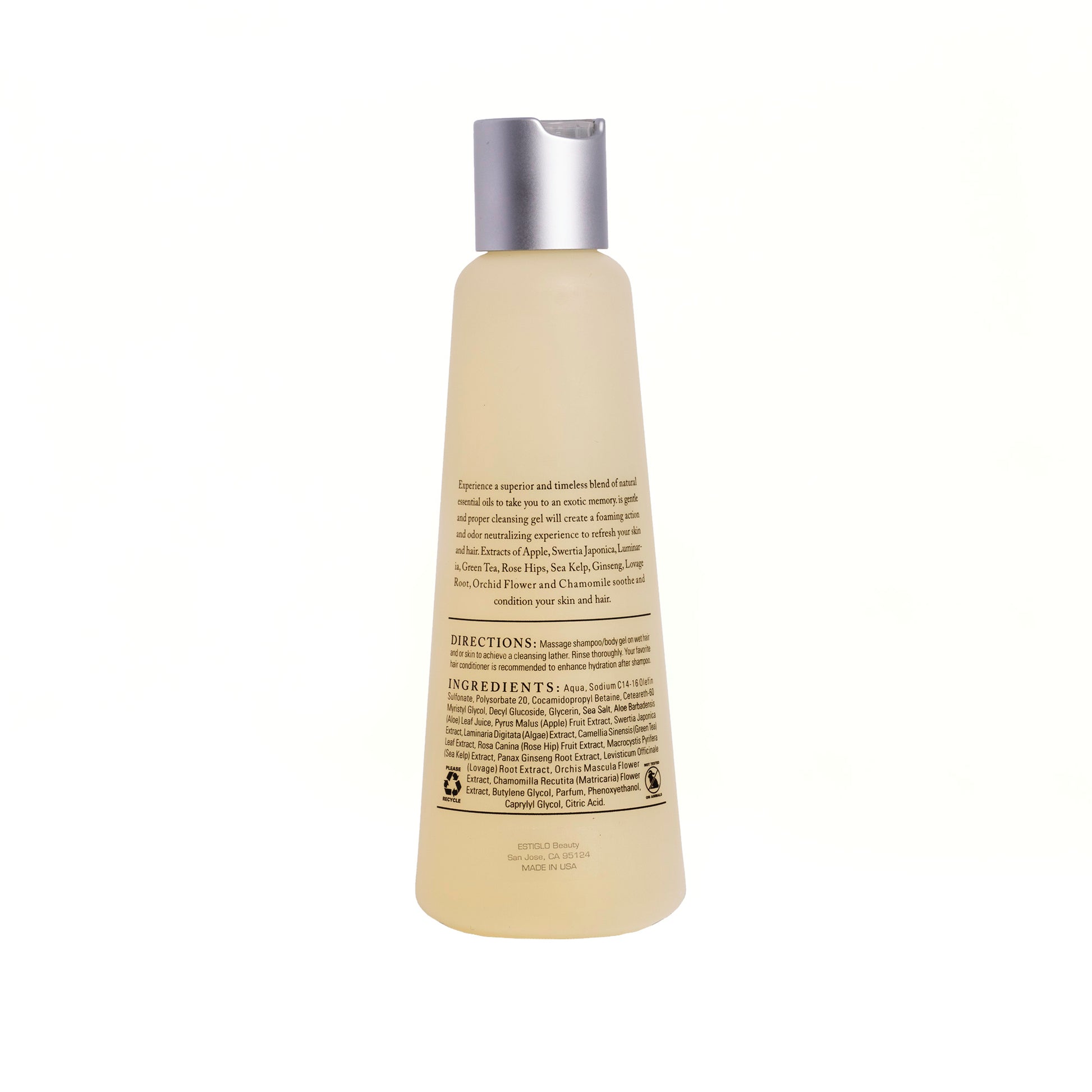 Experience a superior and timeless blend of natural essential oils to take you to an exotic memory. This gentle and proper cleansing gel will create a foaming action and odor neutralizing experience to refresh your skin and hair. Extracts of Apple, Swertia Japonica, Luminaria, Green Tea, Rose Hips, Sea Kelp, Ginger, Lovage Root, Orchid Flower and Chamomile soothe and condition your skin and hair.