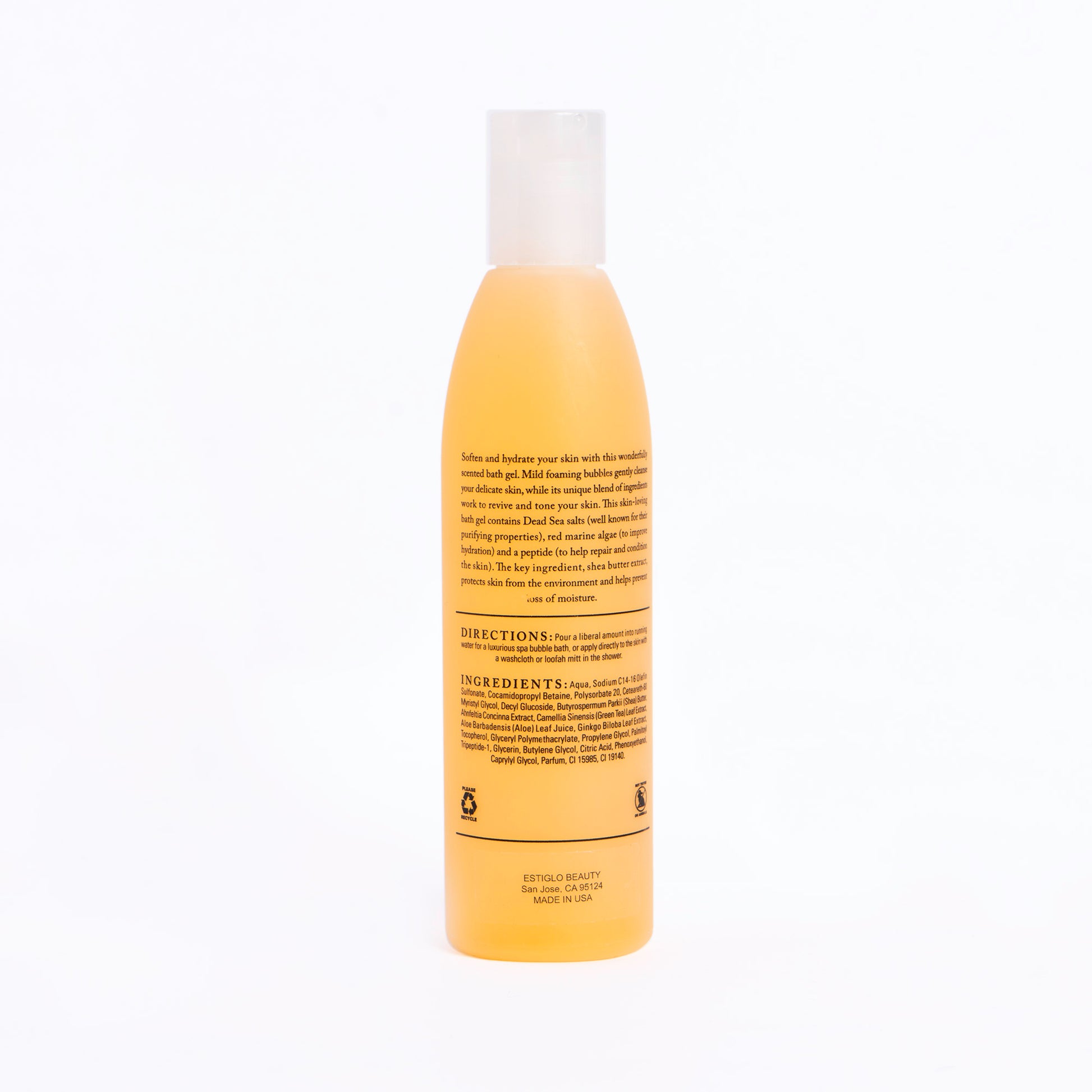 Soften and hydrate with this lemon, lavender and vanilla scented body gel. Mild foaming bubbles gently cleanse your delicate skin. Shea Butter, Red Marine Algae, Peptides, Gingko Biloba Root Extract, Aloe Vera Leaf Juice, Vitamin E, Chamomile Extract and Dead Sea Salts provide reviving and toning properties in this skin loving gelee.